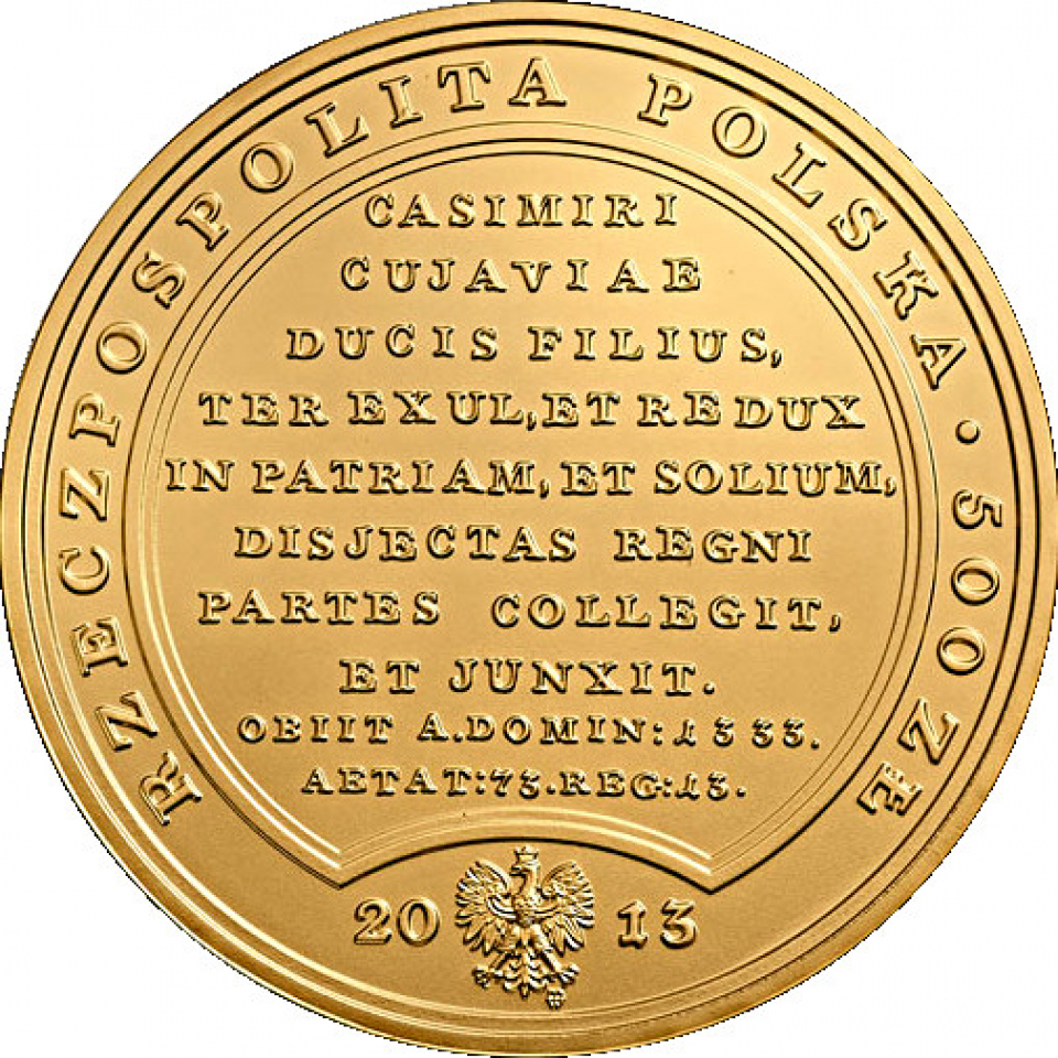 Надпись: RZECZPOSPOLITA POLSKA • 50 ZŁ CASIMIRI CUJAVIAE DUCIS FILIUS, TER EXUL, ET REDUX IN PATRIAM, ET SOLIUM DISJECTAS REGNI PARTES COLLEGIT, ET JUNXIT. OBIIT A.DOMIN.1333. AETAT: 73. REG: 13. 2013 MW