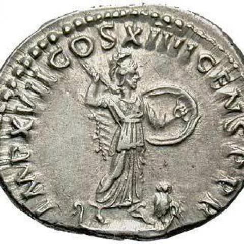 | Реверс | IMP. XVII COS. XIIII CENS. P. P. P. — Минерва стоит на корабле влево занеся копье и держа щит у ее ног сова. |