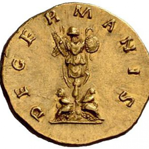 | Реверс | DE GERMANIS — трофей состоящий из шлема доспехов щитов и копий; у основания два пленника сидят спиной друг к другу со связанными руками за спиной. |