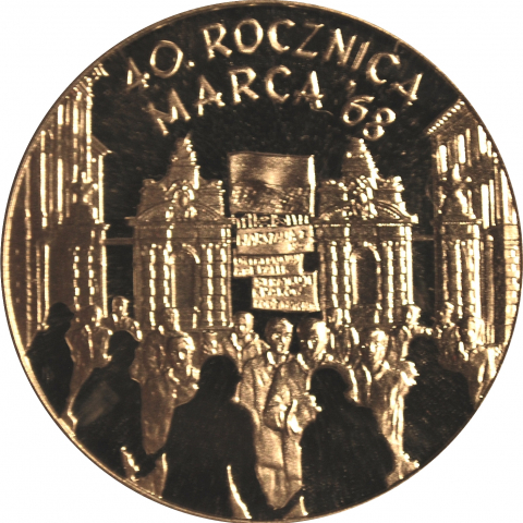 По кругу сверху, «ROCZNICA MARCA` 68 »(40-ЛЕТИЕ МЕЖДУ МАРТАМИ 1968 года). В центре, перед Варшавским университетом, стилизованный флаг, символизирующий национальный флаг Польши и стилизованные изображения баннеров. Внизу толпа протестующих учеников и пять силуэтов милиционеров.