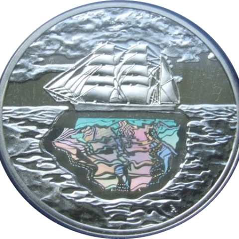 Стилизованное изображение барка назвали Отаго и стилизованное изображение облаков выше. Ниже, голограмма показывает отражение барка в воде и меняет цвета в зависимости от угла обзора.