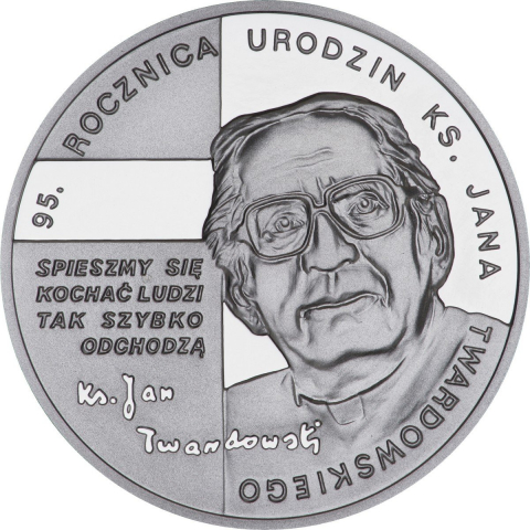 Надпись: 95. ROCZNICA URODZIN KS. JANA TWARDOWSKIEGO SPIESZMY SIĘ KOCHAĆ LUDZI TAK SZYBKO ODCHODZĄ Ks. Jan Twardowski