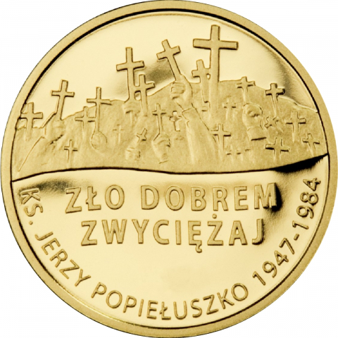 Надпись: ZŁO DOBREM ZWYCIĘŻAJ KS. JERZY POPIEŁUSZKO 1947–1984