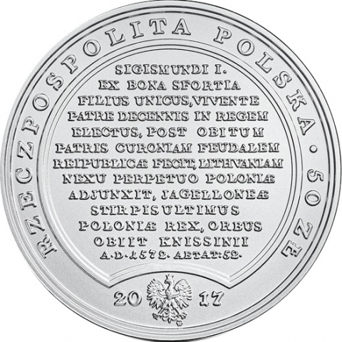 Надпись: RZECZPOSPOLITA POLSKA · 50 ZŁ 2017 MW SIGISMUNDI I. EX BONA SFORTIA FILIUS UNICUS, VIVENTE PATRE DEGENNIS IN REGEM ELECTUS, POST OBITUM PATRIS CURONIAM FEUDALEM REIPUBLICAE FECIT, LITHVANIAM NEXU PERPETUO POLONIAE ADJUNXIT, JAGELLONES STIRPISULTIMUS POLONIAE REX, ORBUS OBIIT KNISSINII A·D·1572·AETAT:52·