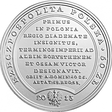 Надпись: RZECZPOSPOLITA POLSKA · 50 ZŁ PRIMUS/IN POLONIA/REGIO DIADEMATE/INSIGNITUS,/TERMINOS IMPERII AD/ALBIM BORYSTHENEM/ET OSSAM VICTOR/ DESIGNAVIT./OBIIT A. DOMIN: 1025./ AETAT: 58. REG: 33. 2013 MW