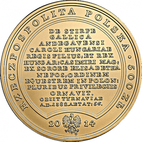Надпись: RZECZPOSPOLITA POLSKA • 50 ZŁ DE STIRPE/GALLICA/ANDEGAVENSI/CAROLI HUNGARIAE/REGIS FILIUS, ET REX/HUNGAR: CASIMIRI MAG:/EX SORORE ELISABETHA/NEPOS, ORDINEM/EQUESTREM IN POLON:/PLURIBUS PRIVILEGIIS/ORNAVIT./OBIIT TYRNAVIAE/A.D. 1382. AETAT: 56 2014