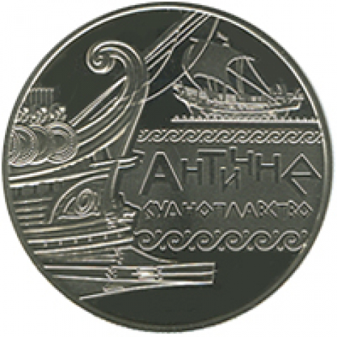 На реверсе монеты размещено: слева стилизованное изображение прорех - носа античного корабля, которое часто встречается на греческих и римских монетах как символ мореплавания, вверху справа - судно под парусами и на фоне широкой меандровий ленты стилизованная надпись - АНТИЧНОЕ / СУДОХОДСТВО.